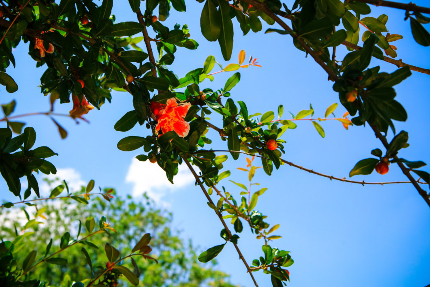 石榴花姿态优美,枝叶秀丽。初春时节,嫩叶吐绿,婀娜多姿;盛夏时分,繁花似锦;而在秋季,累累硕果悬挂枝头,一派生机。