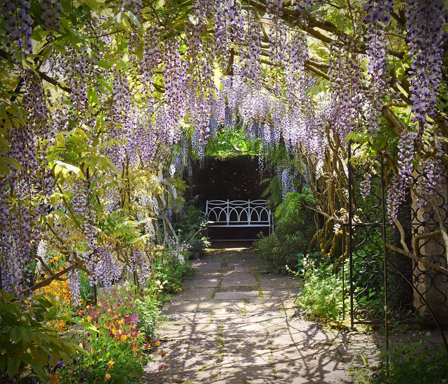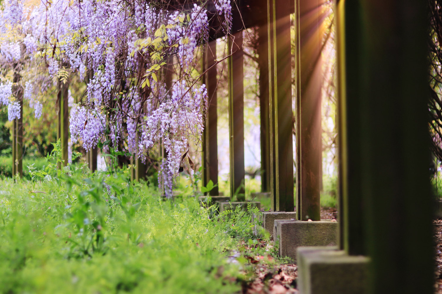紫藤花缠绕生长,所以在移植前要先定植。在周围搭建坚固的棚架,将粗大的枝条绑在上面,让其缠绕生长。紫藤的寿命较长,枝粗叶茂,所以支架要坚实耐久