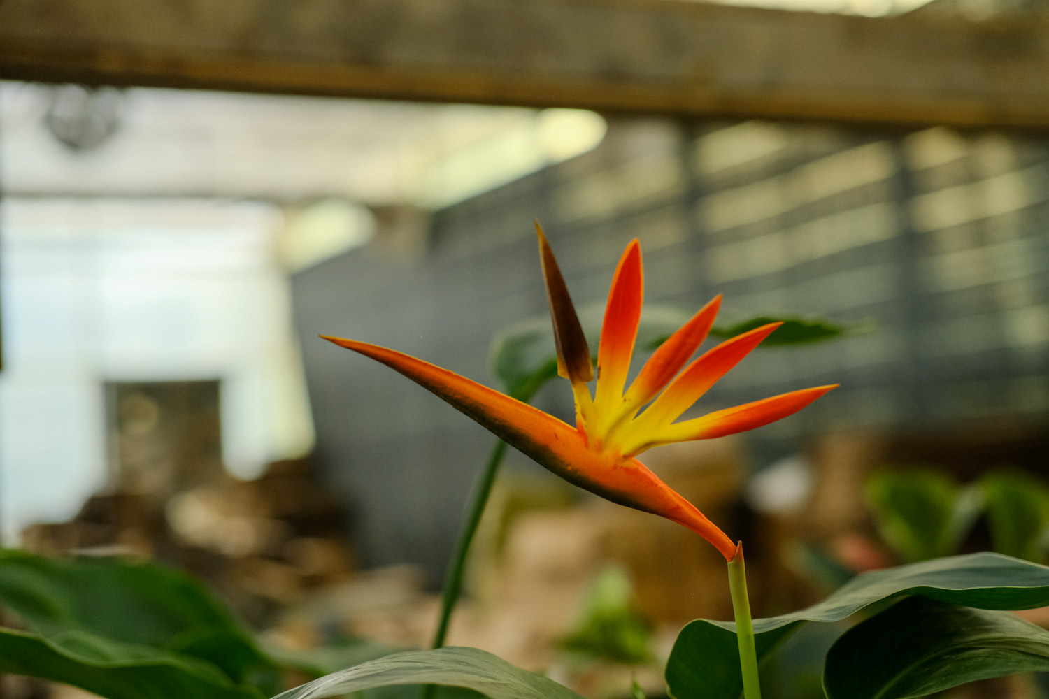 无叶鹤望兰株高1米左右,叶呈棒状,花大,花萼橙红色,花瓣紫色。