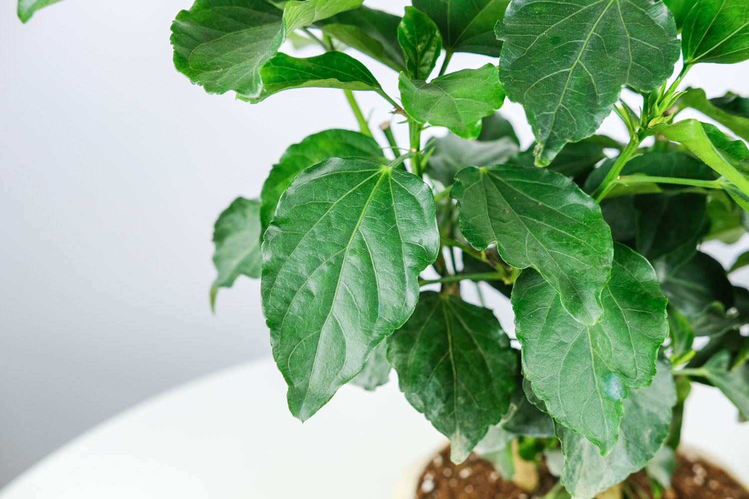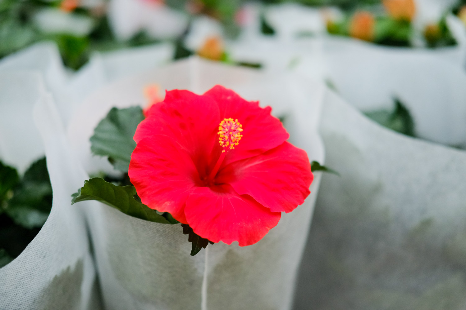 锦叶扶桑,花朵比较小, 颜色为鲜红色,其叶片狭长,呈披针形,颜色为绿色,上面分布着粉、红、白色的斑纹。