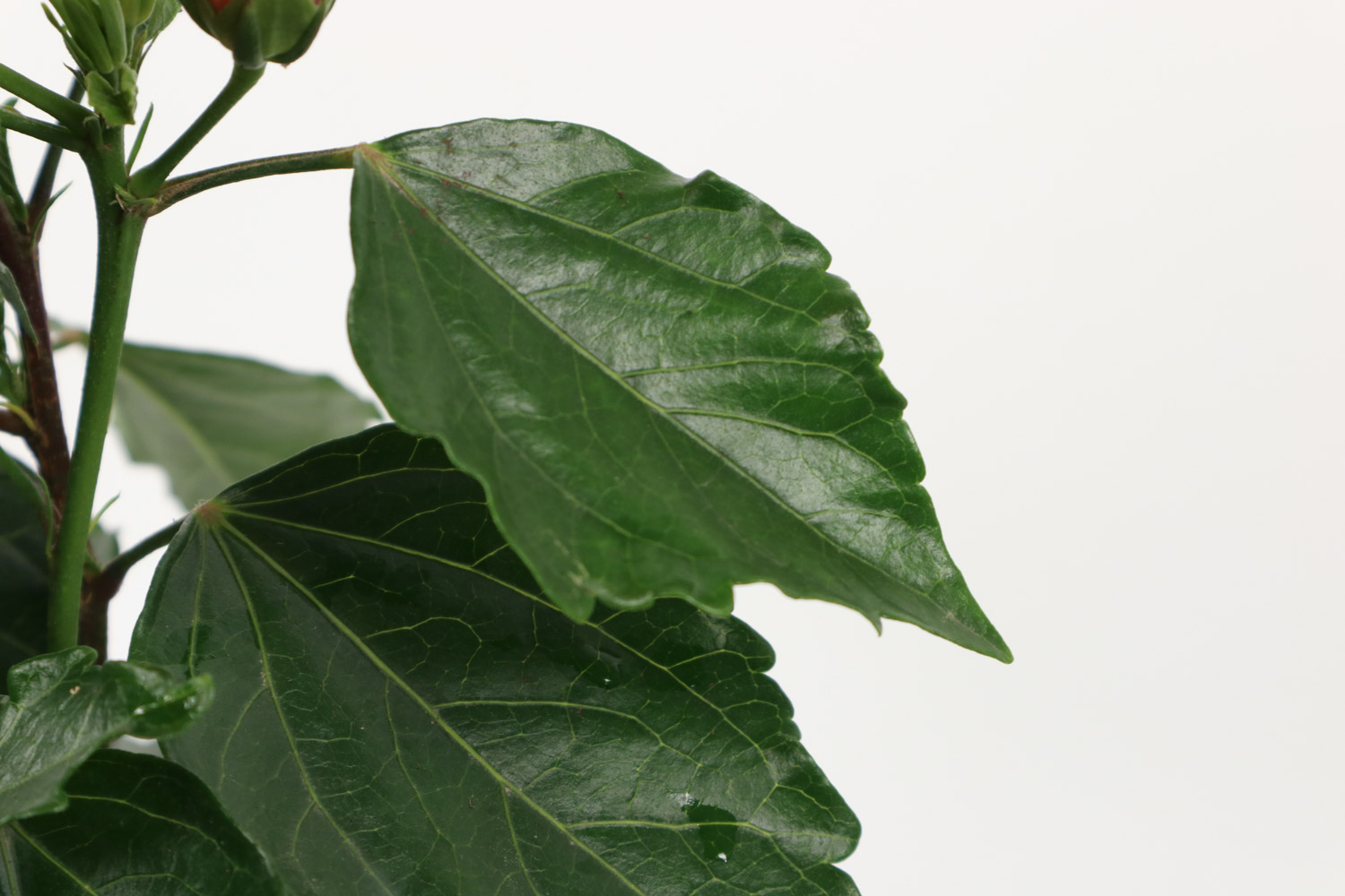 马坦扶桑,花朵为洋红色,花心为深红色,脉纹颜色也是深红色,其叶片为绿色,茎干颜色为红色。