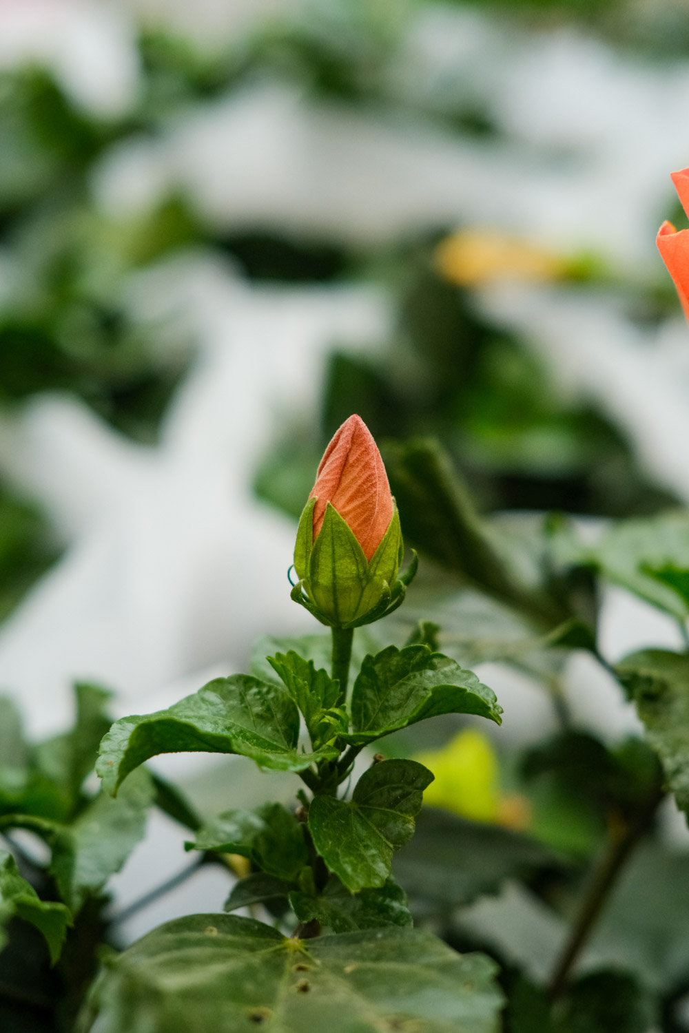 砖红扶桑,其花朵为橙红色,花心为黑红色。
