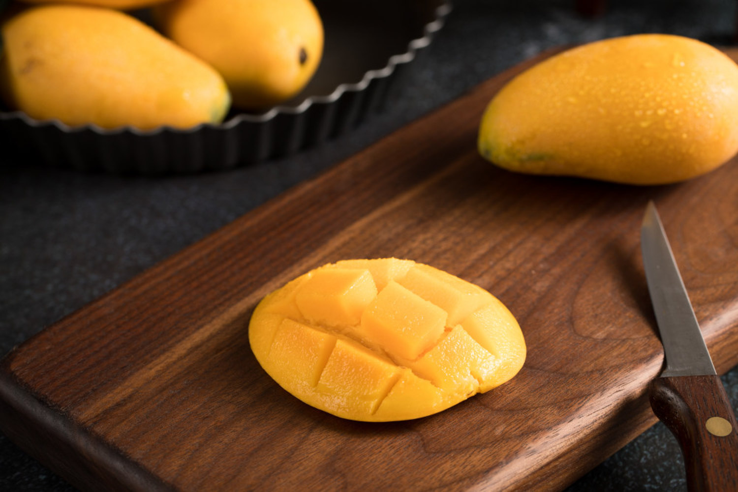 1.直接食用:首先用清水洗净芒果,然后用刀贴着芒果的核竖着切开。切开后可以用勺子直接挖着吃,或者将其切成网格状,然后在背部用手指轻轻一顶再直接食用即可。