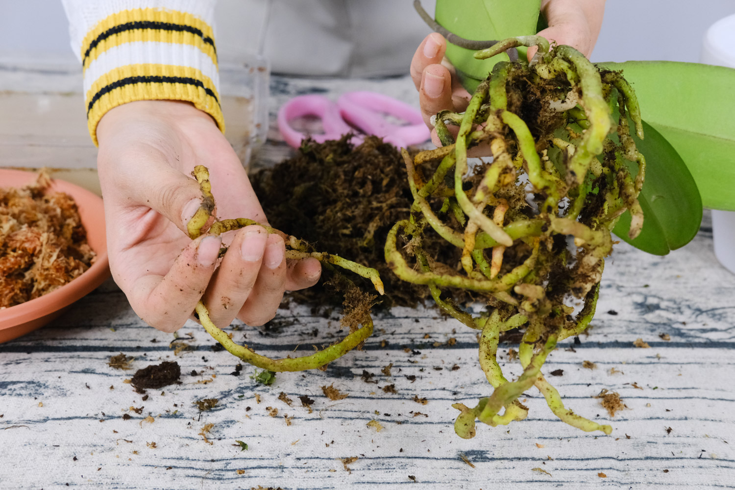 蝴蝶兰烂根通常是浇水太多,施肥太多或者土壤不适导致的。不管是哪种原因,发现后都要尽快脱盆,剪掉烂根才行。修剪后还要消毒,并放在阴凉处等伤口晾干再上盆。原盆土也要全部换掉,准备新土。备好后就可上盆栽种。注意栽好后先控光控水,等适应环境之后再恢复管理。,
