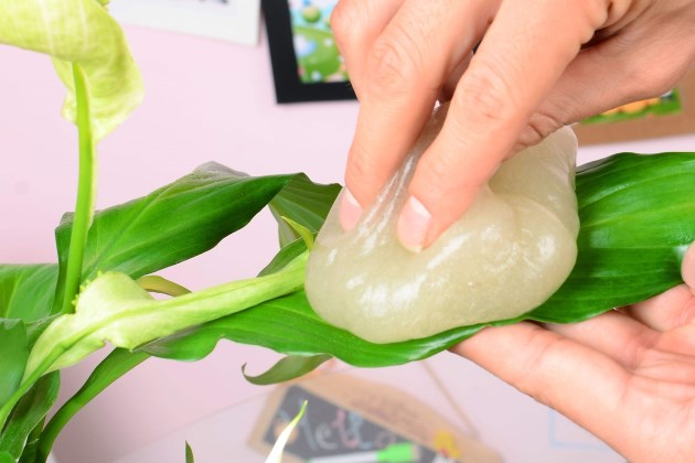 使用时,把香蕉皮切块再擦拭,更方便。使用的时候注意不要在叶子上残留香蕉皮的肉末哦!