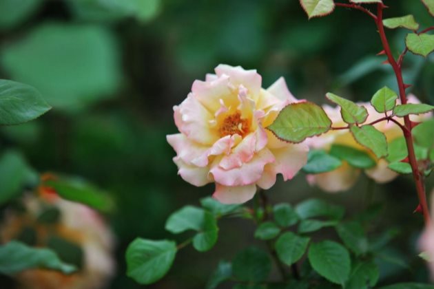 月季花的叶子表现出泛黄的颜色,叶子面上还有一些凹凸不平的地方,这种是缺乏特定的营养元素导致的。